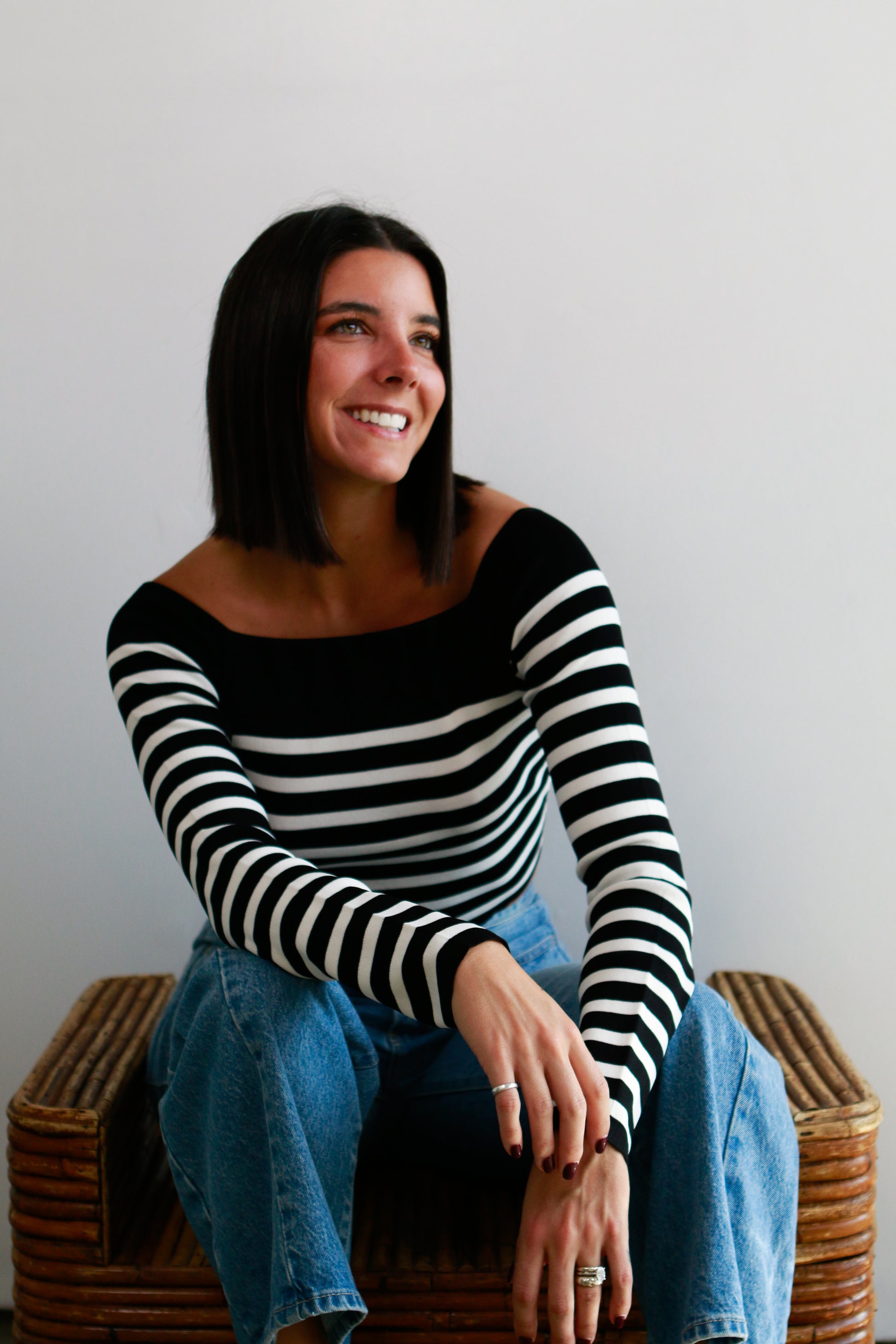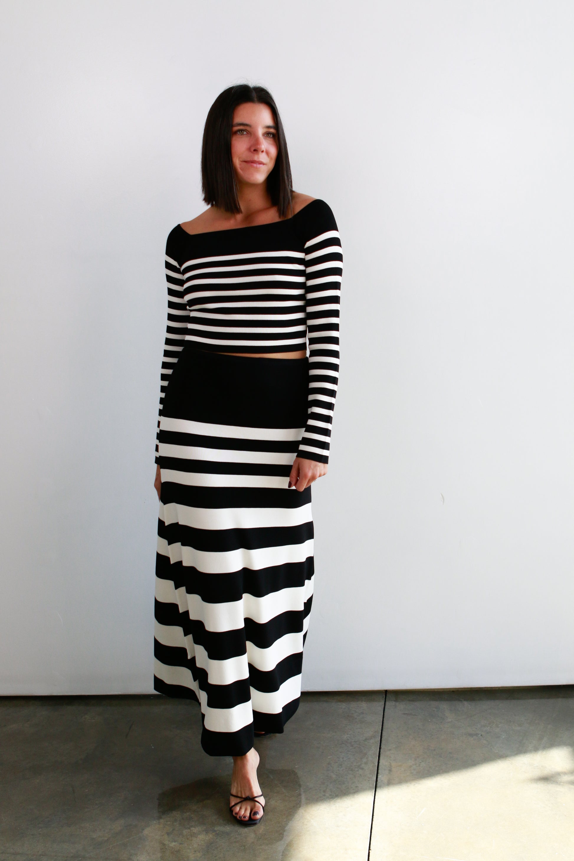 The Odette Top is a playful twist on a classic look, featuring stretchy fitted fabric that hugs your shape comfortably. Its timeless black-and-white stripes pair perfectly with a chic square neckline and long sleeves, while the cropped cut adds a flirty edge to your outfit. Make it a set!