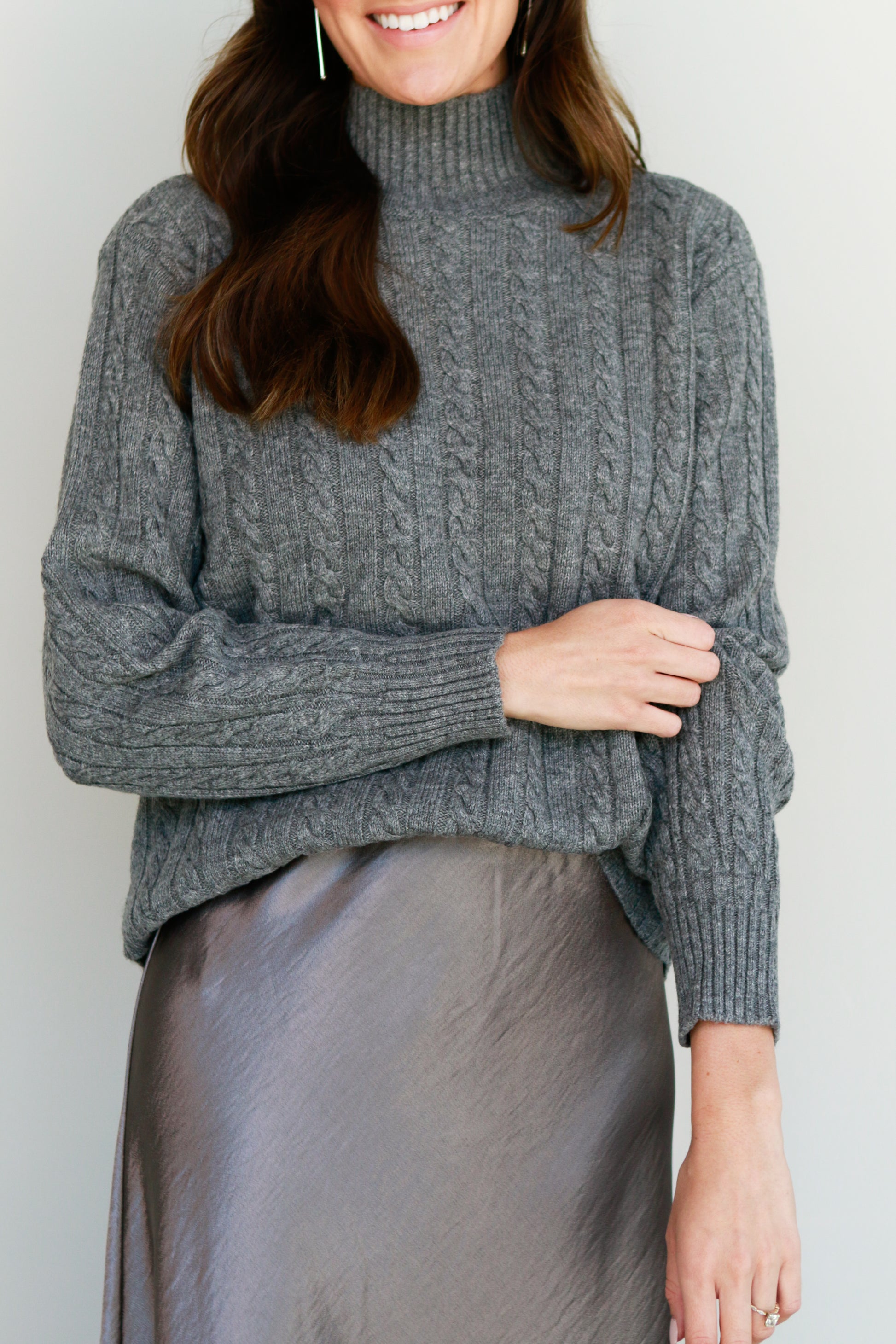 Elevate your wardrobe with this sophisticated cable knit sweater, featuring a timeless mock neck and ribbed cuffs for a polished finish. The slight scoop hemline adds a subtle modern touch, while the classic cable knit pattern ensures lasting elegance. Available in versatile taupe and gray, this sweater seamlessly blends comfort and style for any occasion.
