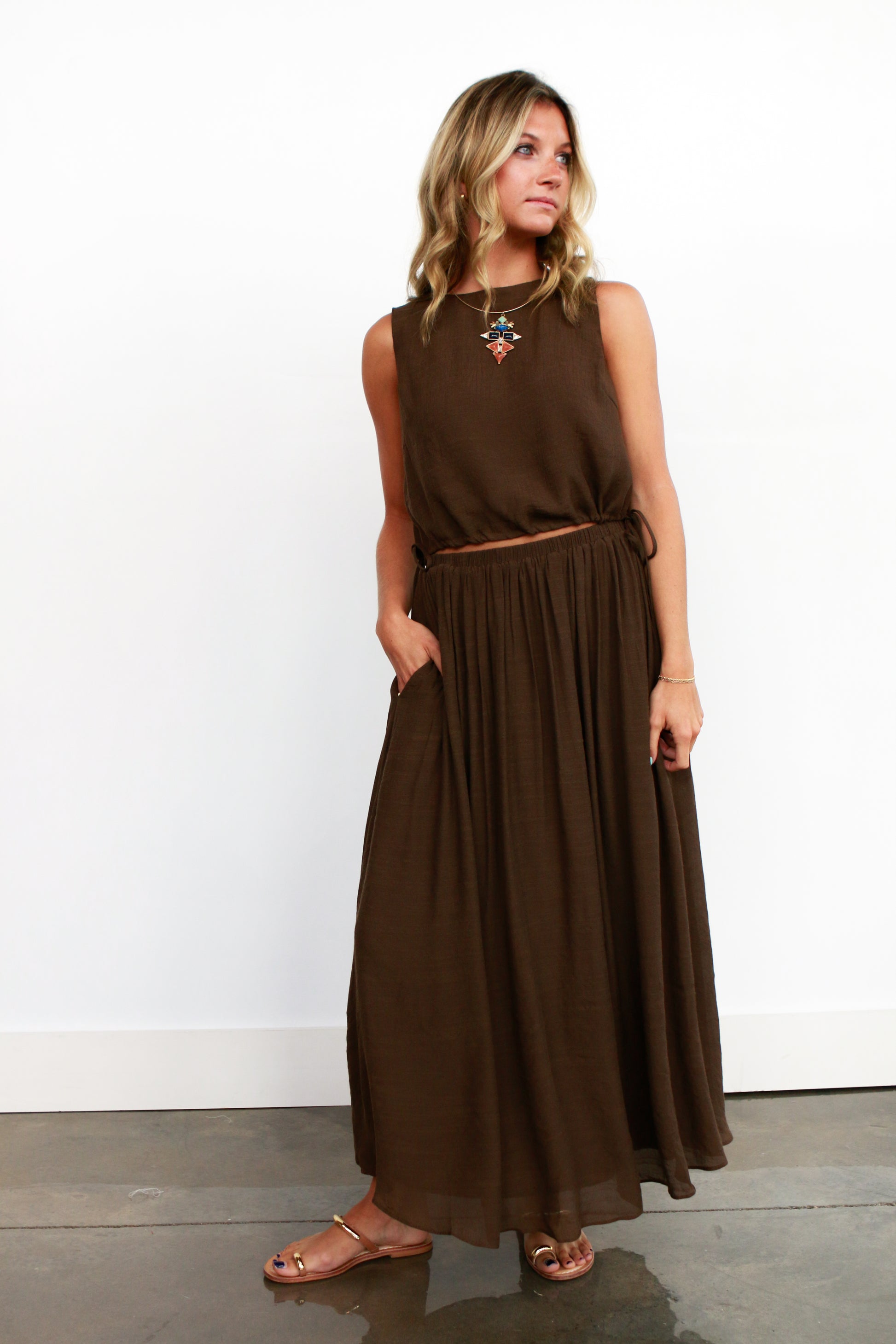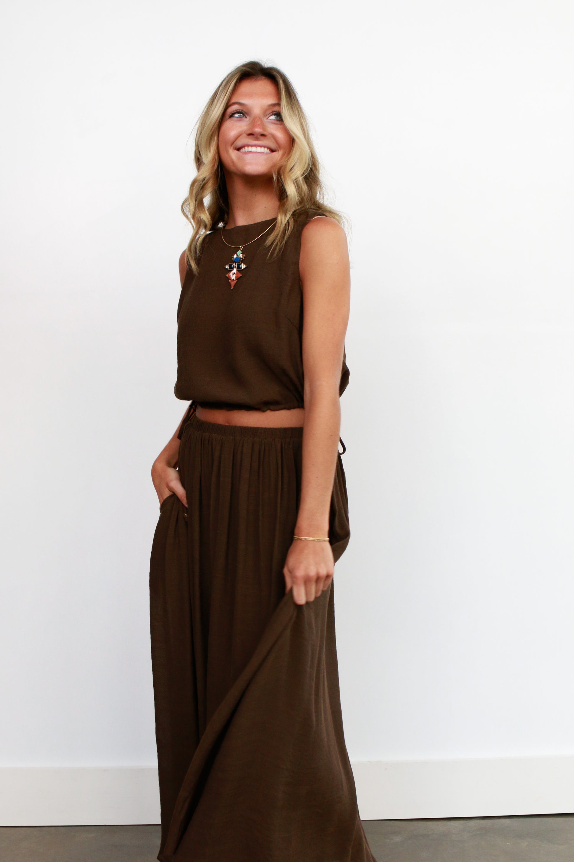 Embrace the playful charm of the Marie Skirt Set, featuring a lightweight, breezy fabric that moves with you. The midi skirt’s elastic waistband ensures comfort, while the slightly cropped top with an adjustable tie adds a flirty touch. In rich chocolate brown, this set is your perfect companion for effortlessly transitioning into fall with style and ease.