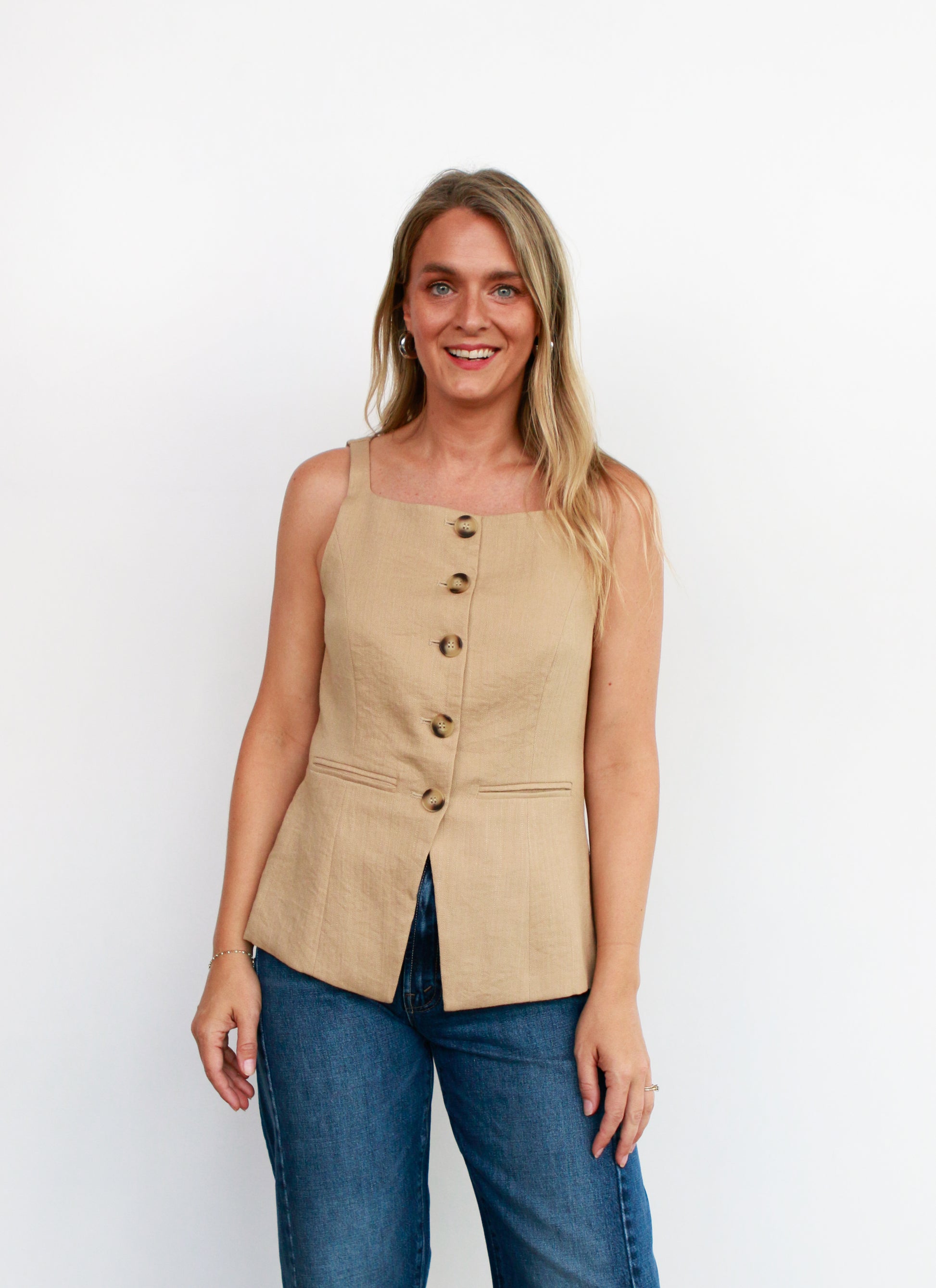 This tan Kori Linen Vest blends breezy comfort with chic style. It features tortoise shell buttons and a tie-back for a perfect fit. Pair it back to your favorite dark denim or even layer over a dress!