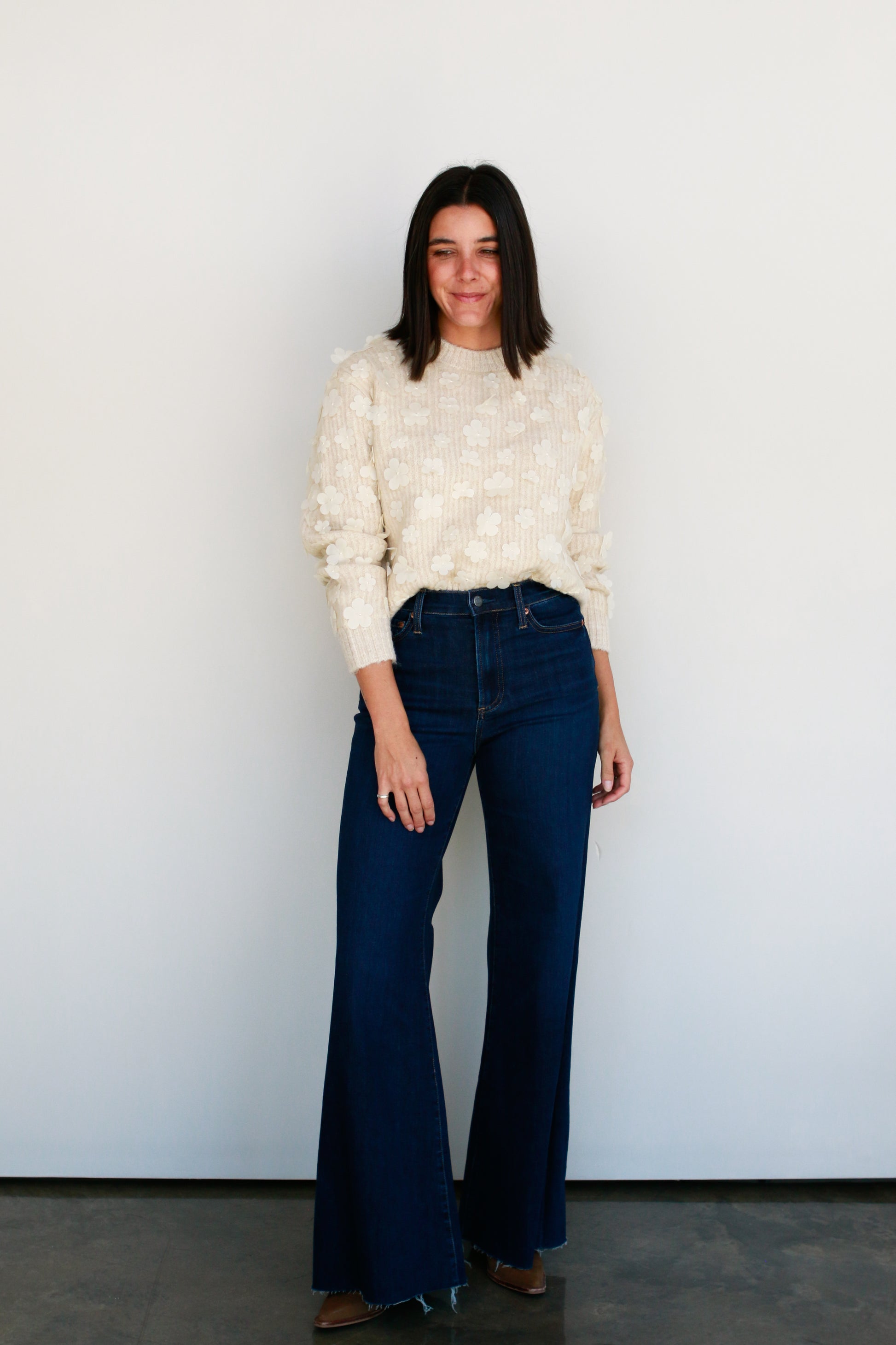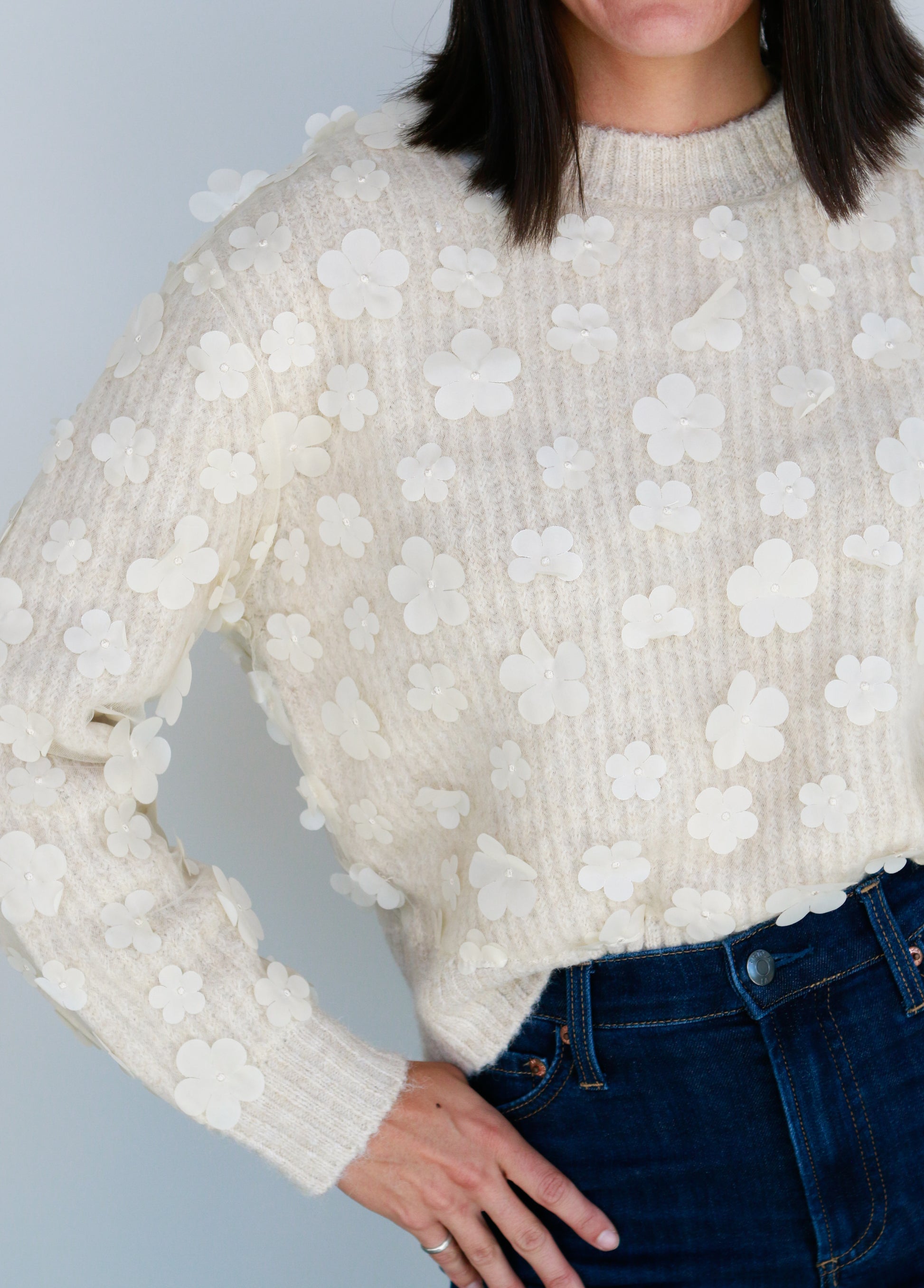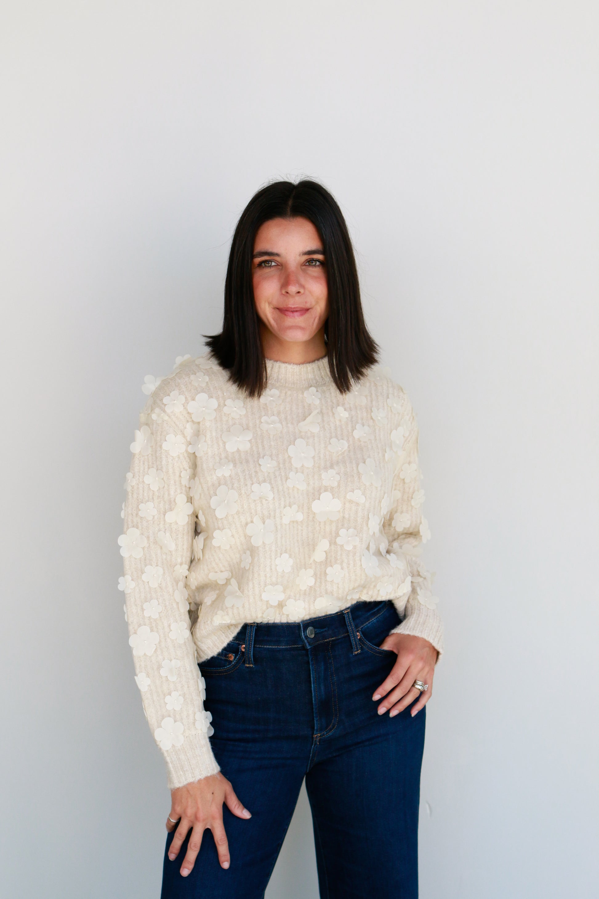 This cream crew neck sweater blends timeless elegance with delicate detail. Crafted from soft fabric, it features a sheer mesh overlay adorned with intricate, three-dimensional paper-thin flowers, creating a subtle yet enchanting texture. Perfect for adding a refined touch to any outfit, it offers both comfort and sophisticated style.