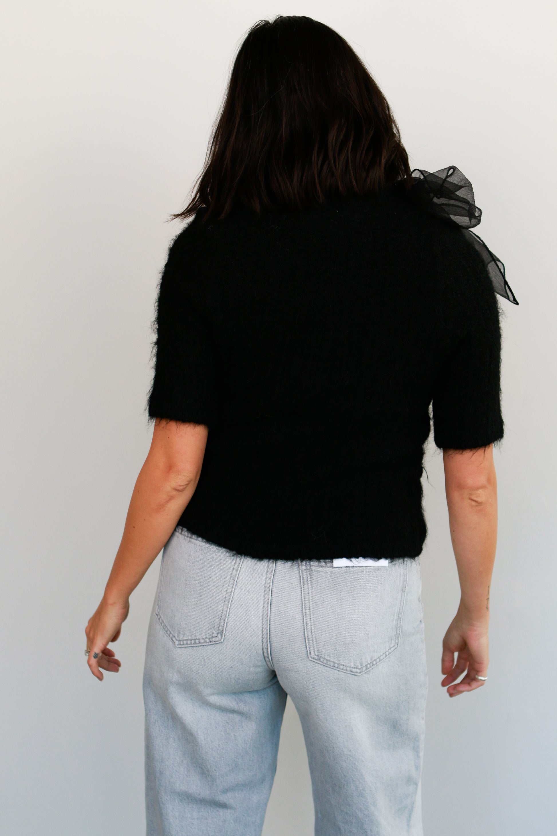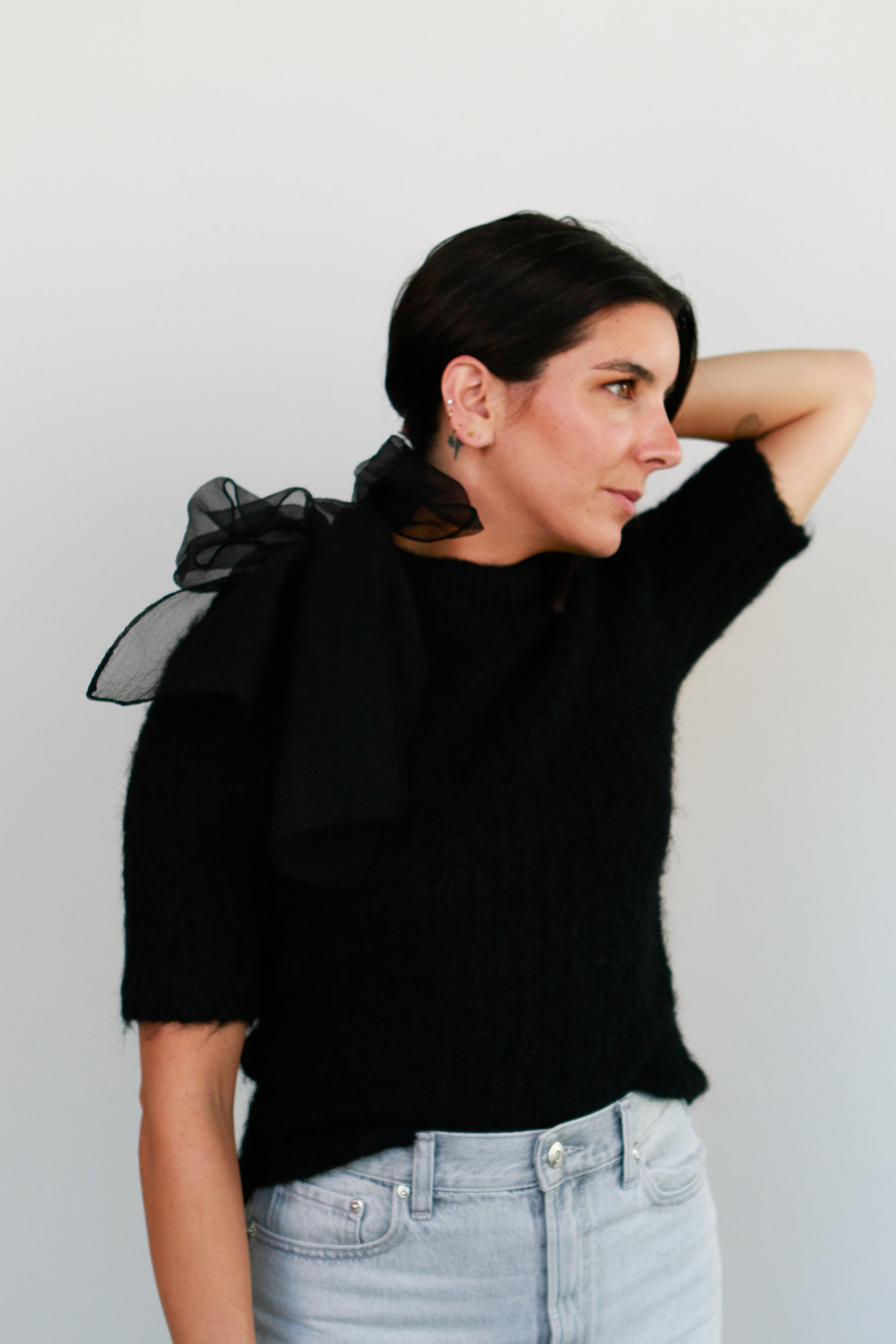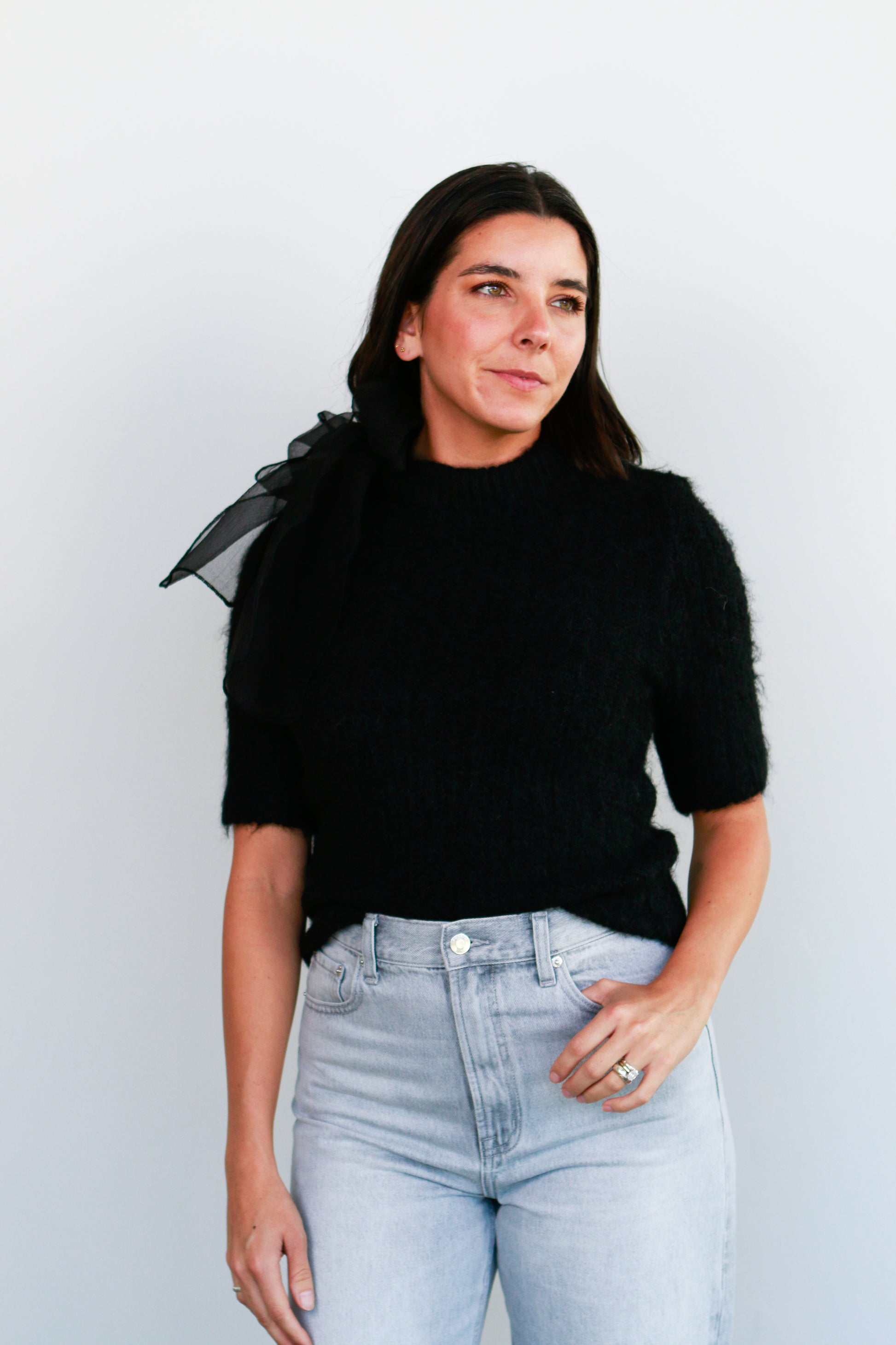 The Rosalina Sweater combines timeless chic with holiday-ready elegance. Crafted from a soft, textured fabric, it features refined elbow-length sleeves and a delicate organza tie at the collar for a subtle statement. This black sweater offers sophisticated style perfect for festive occasions or elevating your everyday wardrobe.
