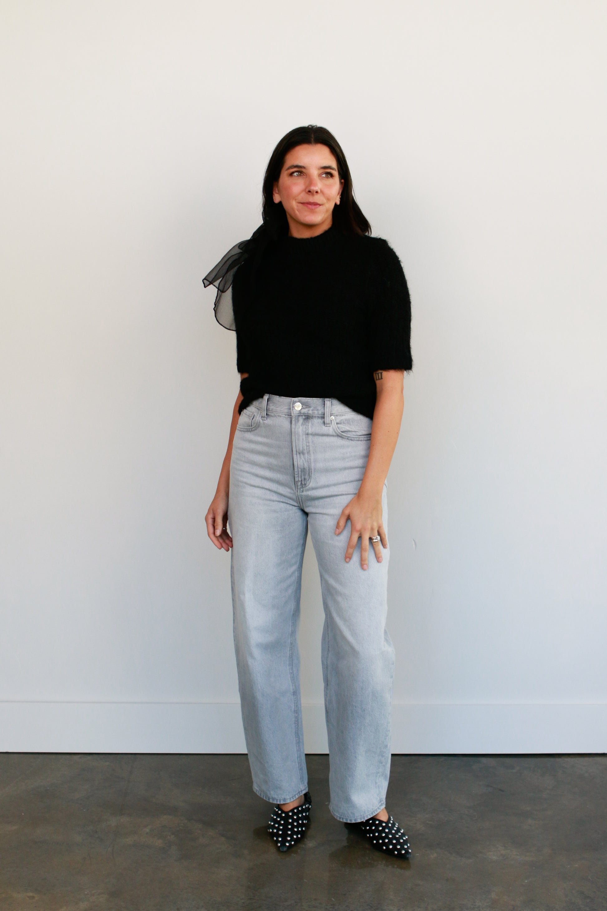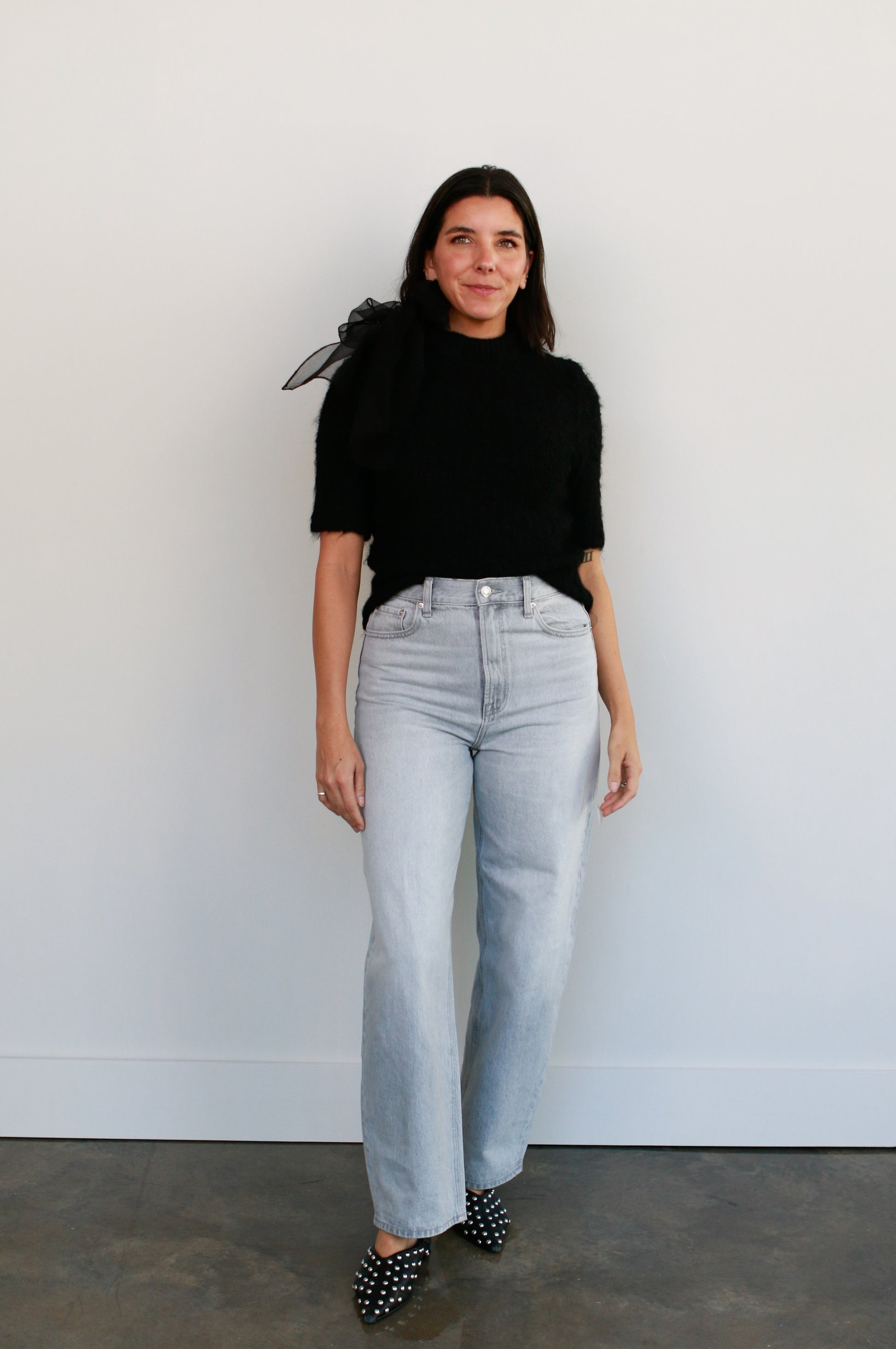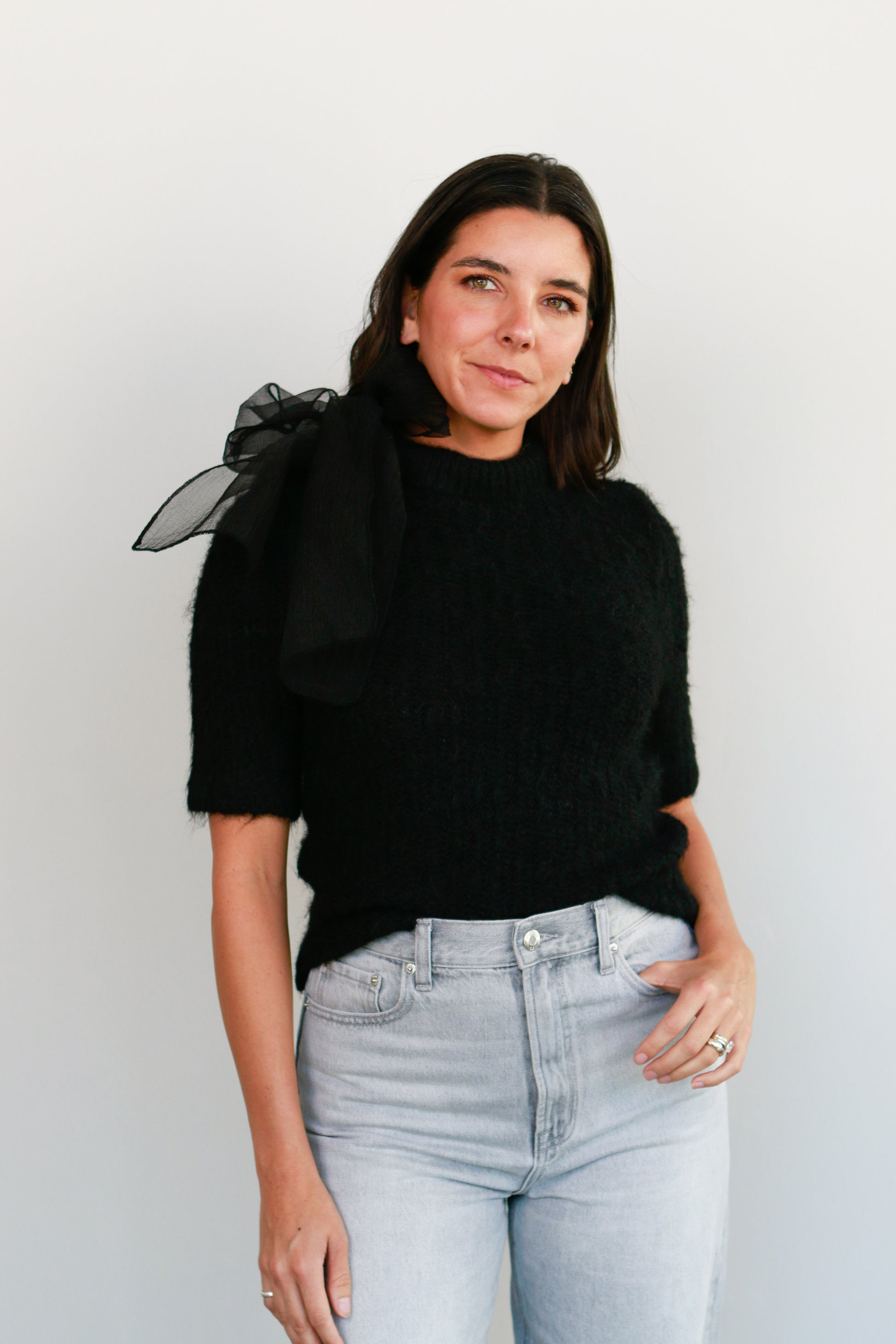 The Rosalina Sweater combines timeless chic with holiday-ready elegance. Crafted from a soft, textured fabric, it features refined elbow-length sleeves and a delicate organza tie at the collar for a subtle statement. This black sweater offers sophisticated style perfect for festive occasions or elevating your everyday wardrobe.