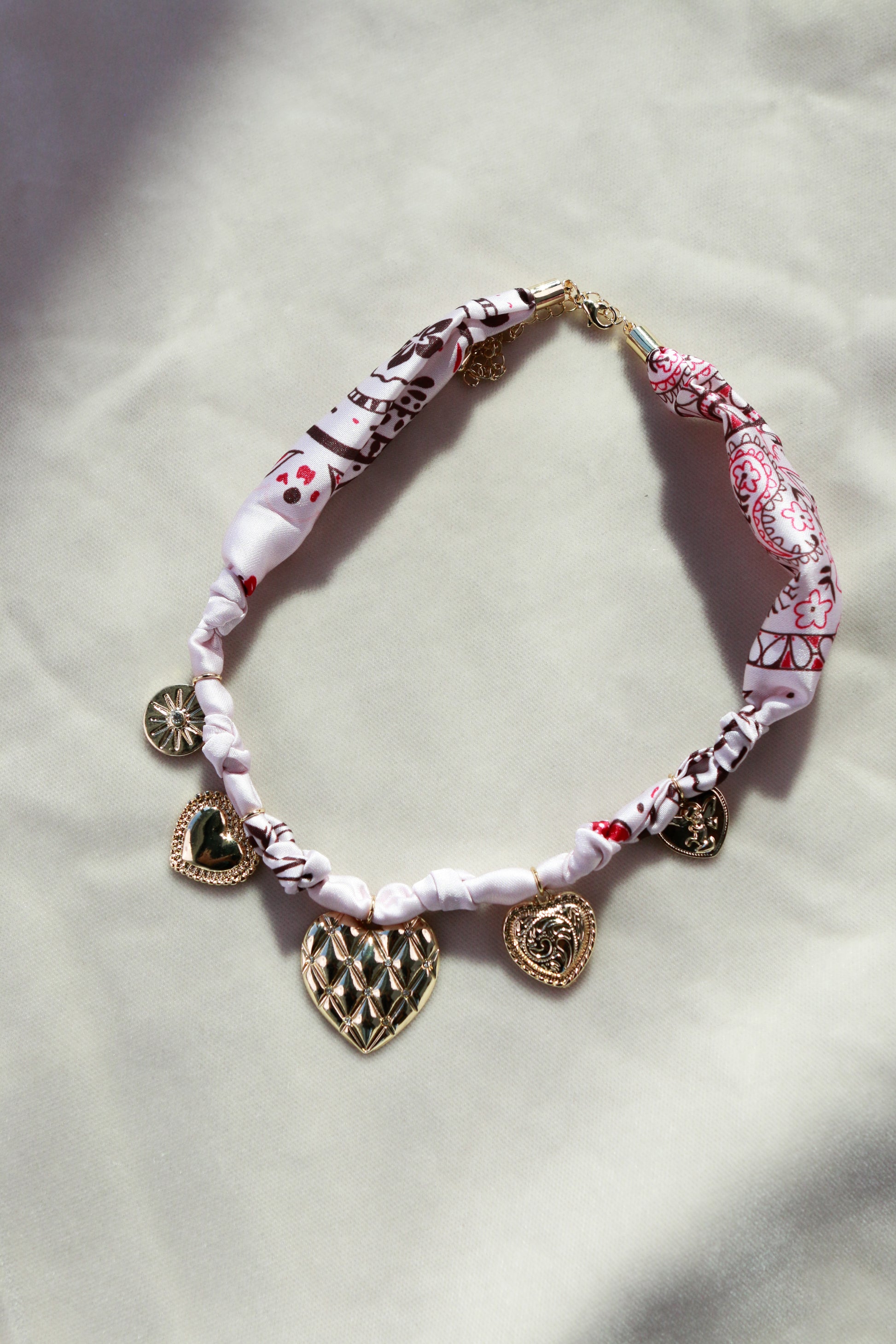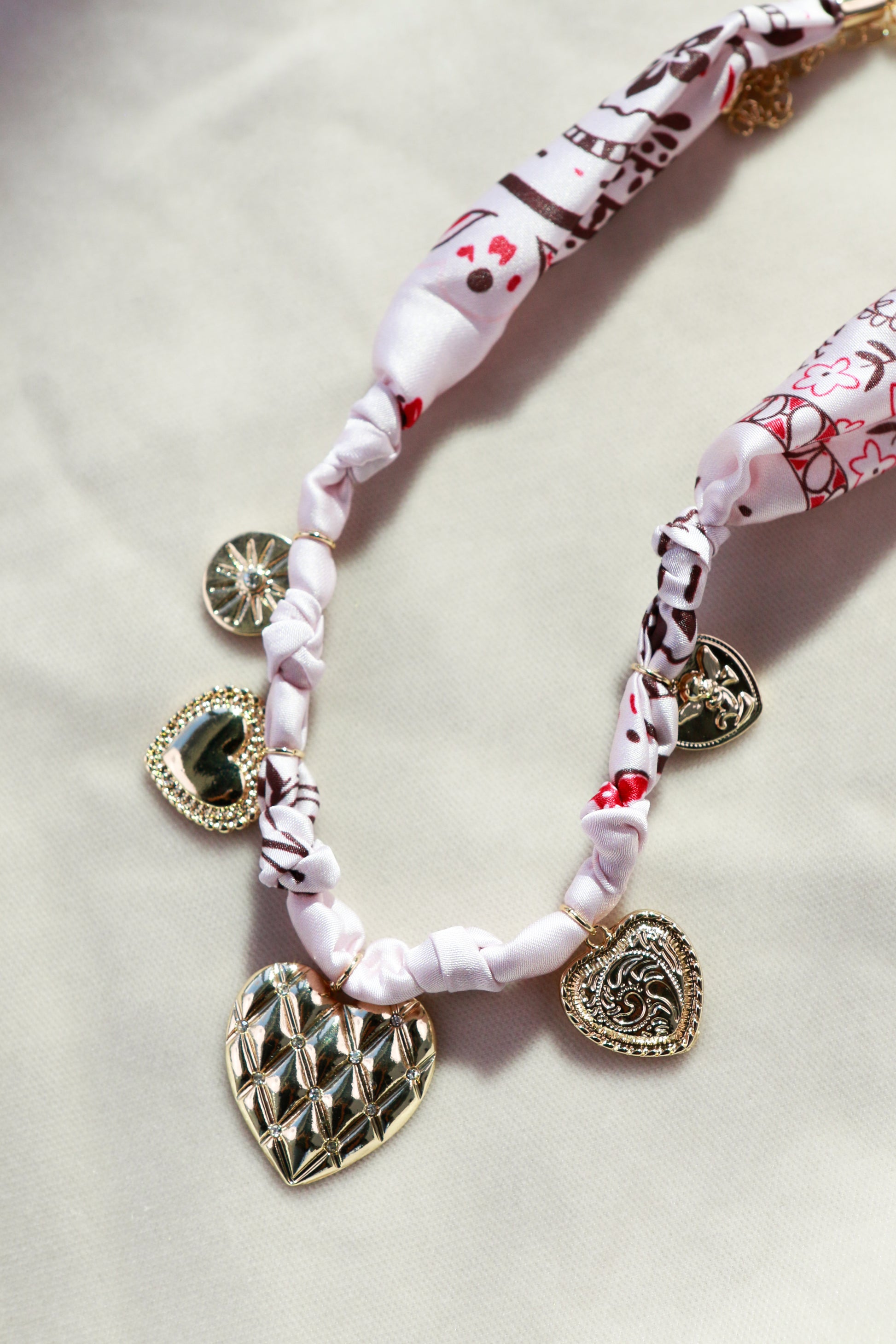 Elevate your accessory collection with this refined pink satin scarf, adorned with five delicate gold heart charms that catch the light beautifully. The luxurious satin finish drapes elegantly around your neck or shoulders, while the charming gold accents add a touch of romantic sophistication to any ensemble. Perfect for layering over dresses, blouses, or sweaters, this versatile piece transitions seamlessly from day to evening wear.