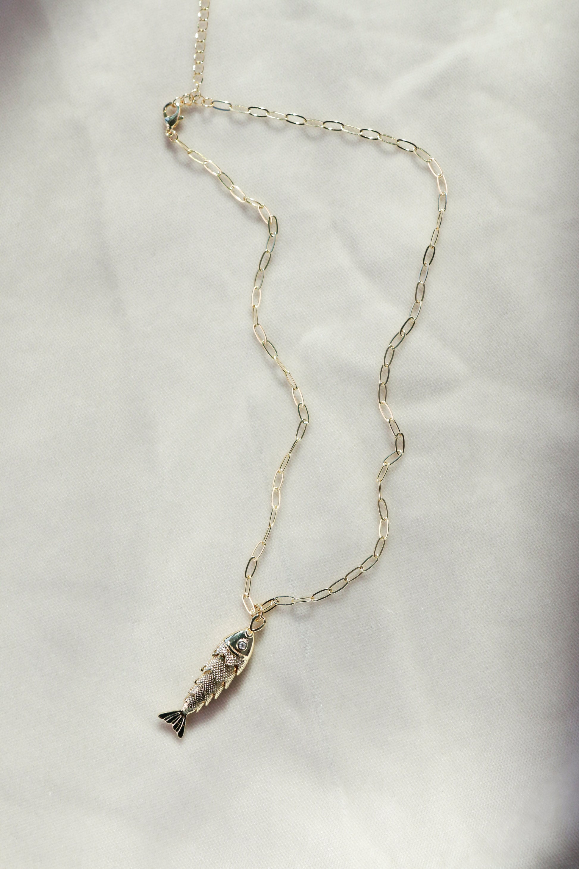 Delicate paperclip chain necklace featuring a movable gold fish charm that glides freely along the length. The adjustable chain allows you to customize the pendant's position, creating a personalized look that transitions effortlessly from day to evening. A refined piece that captures understated elegance with its minimalist design and thoughtful craftsmanship.